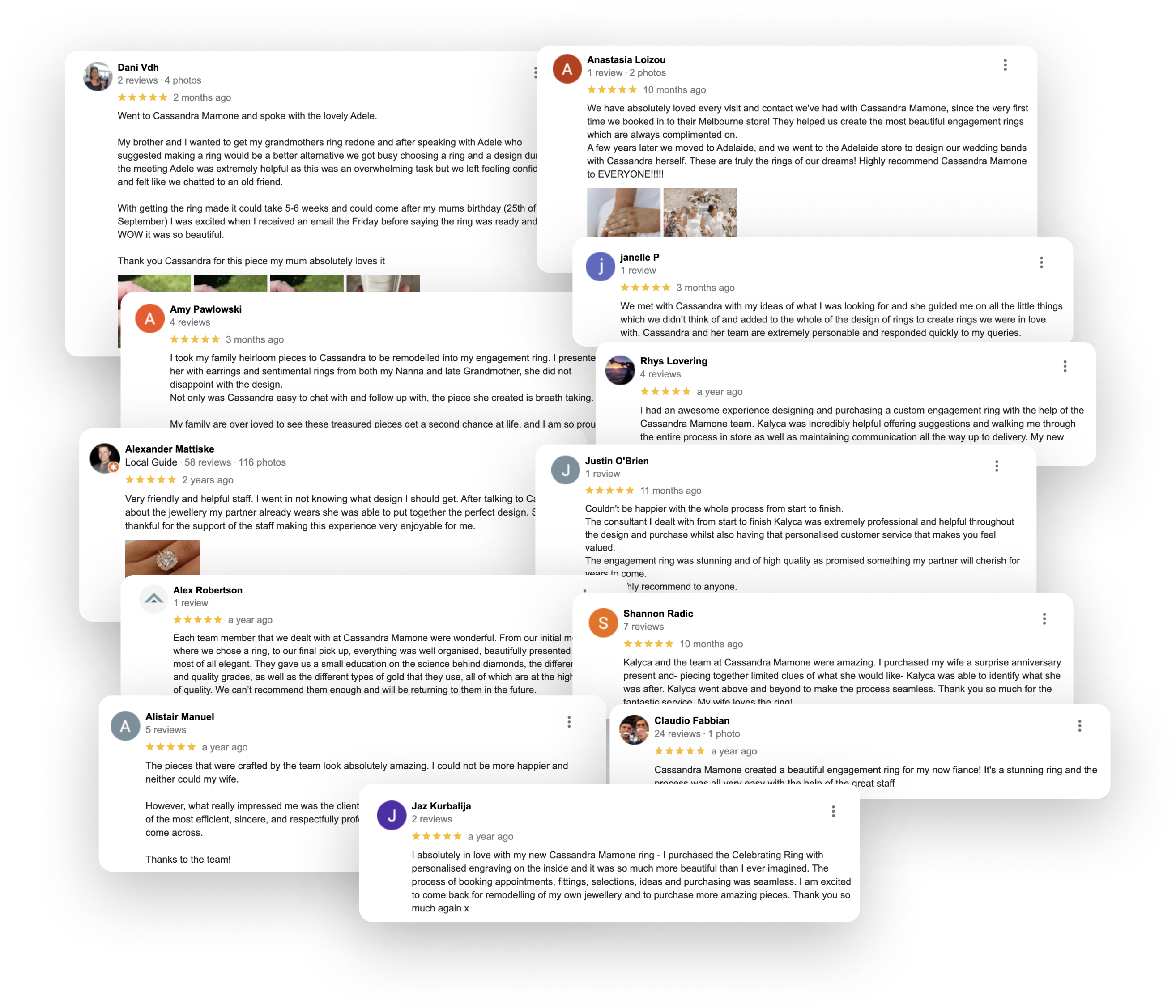 My name is Cassandra Mamone and I’ve designed one-of-a-kind rings for celebrities, influencers, and AFL WAGs over the past decade. Starting with a complimentary design consultation, I’ll help you avoid the long and stressful search most men go through – by custom designing a gorgeous diamond ring that perfectly captures your love story. Imagine confidently proposing with a ring that exceeds even her wildest expectations and makes her family and friends jealous.